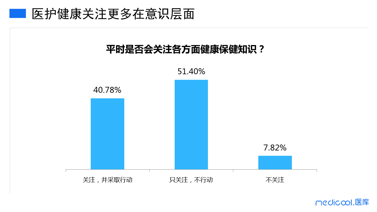 调研结果表明,40.78%的医护确实是会关注,并真实采取行动,而51.40%的则更多是在意识上关注,并不付诸实践。剩下少数的医护甚至表示并不关注健康知识。