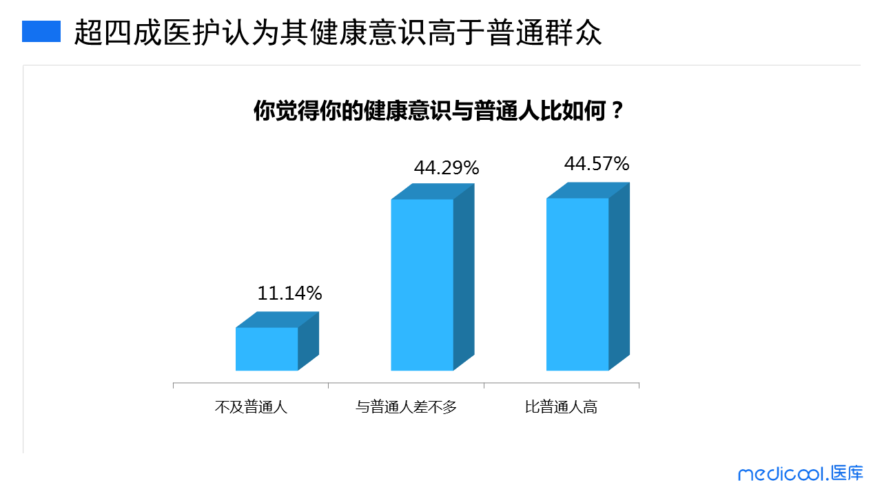 医护们的健康意识水平到底如何呢?结果显示,44.57%的医护认为他们的健康意识还是要比一般群众高的,有44.29%的人则表示与一般群众差不多,更有11.14%的医护觉得他们的健康意识还比不上普通群众。总体来看,医者们对于自己的健康意识评价其实并不是很高。