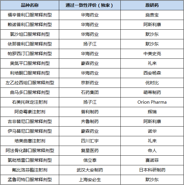 华海药业是本次采购目录中的亮点,华海药业有7个品种入围,其中盐酸帕罗西汀片、利培酮片、福辛普利钠片、赖诺普利片、氯沙坦钾片5个产品目前为独家通过一致性评价药品,而且通过历史中标数据来看,除了福辛普利钠片,其余4个品种在2018年全国平均中标价中,原研厂家与华海的价格相差较大,福辛普利钠片略低于原研药,因此华海这5个产品线占据优势,极有可能在试点城市的医药市场拔得头筹。