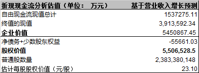 这样,爱尔眼科基于营业收入增长预测估算的股权价值为: 550.6亿元。将股权价值除以完全稀释的流通股数量(2,383,380,148股),就计算出股价为:23.10元/股,比爱尔眼科目前的股价29元左右/股较低。这也说明爱尔眼科的目前的价值并没有被高估。敏感性分析限于篇幅略。