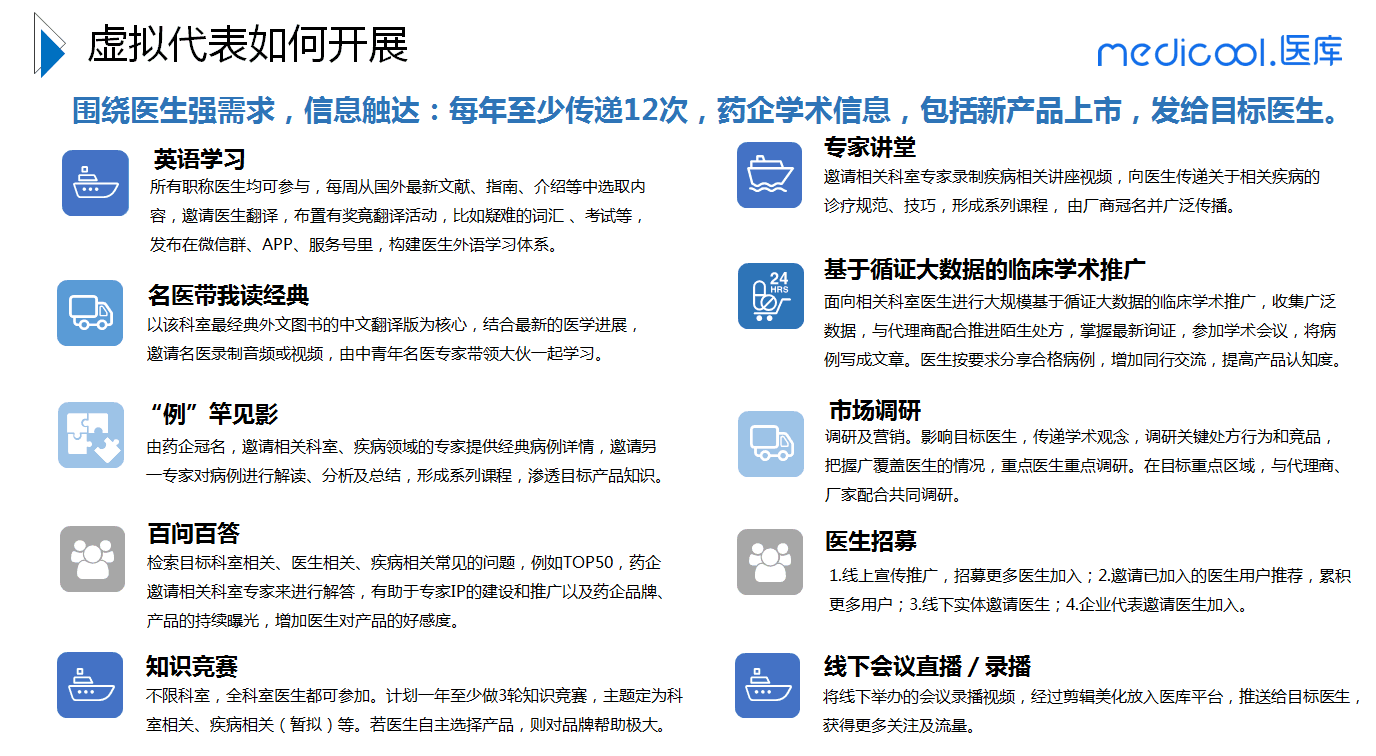 7、基于循证大数据的临床学术推广:面向相关科室医生进行大规模基于循证大数据的临床学术推广,收集广泛数据,与代理商配合推进陌生处方,掌握最新循证,参加学术会议,将病例写成文章。医生按要求分享合格病例,增加同行交流,提高产品认知度。