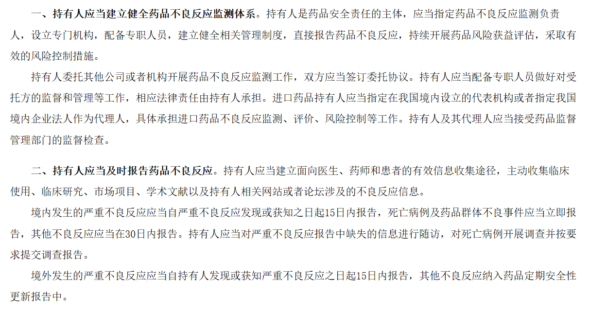公告明确:持有人应当建立面向医生、药师和患者的有效信息收集途径,主动收集临床使用、临床研究、市场项目、学术文献以及持有人相关网站或者论坛涉及的不良反应信息。