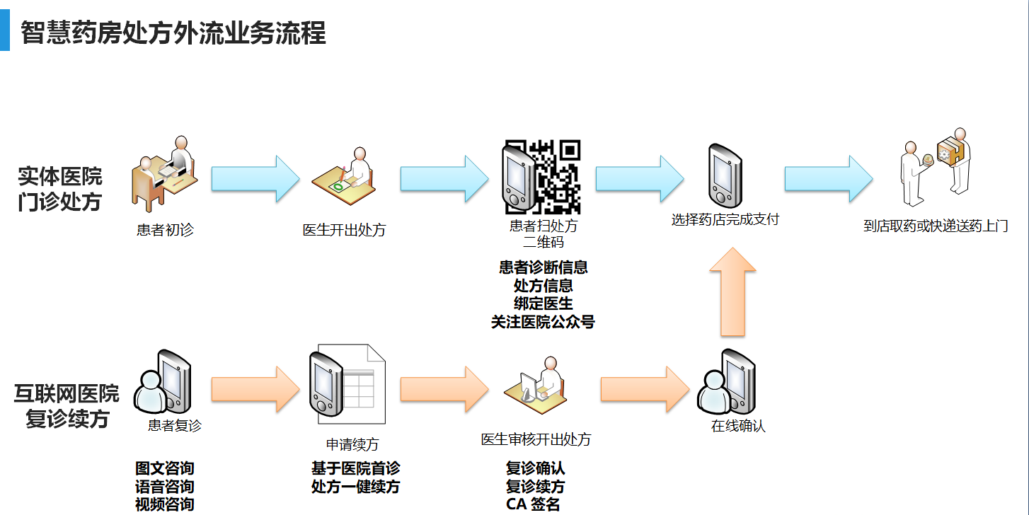 1. 智慧药房平台和医院的信息化系统进行技术对接,并通过HIS系统的改造实现在HIS系统中增加虚拟处方库,门诊医院直接选择虚拟处方库开具外流处方。外流处方优先接入院内院边智慧药房。