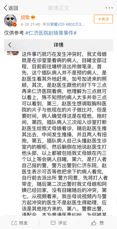 4月26日晚间,知名演员胡歌在微博发声支持赵晓菁医生:
