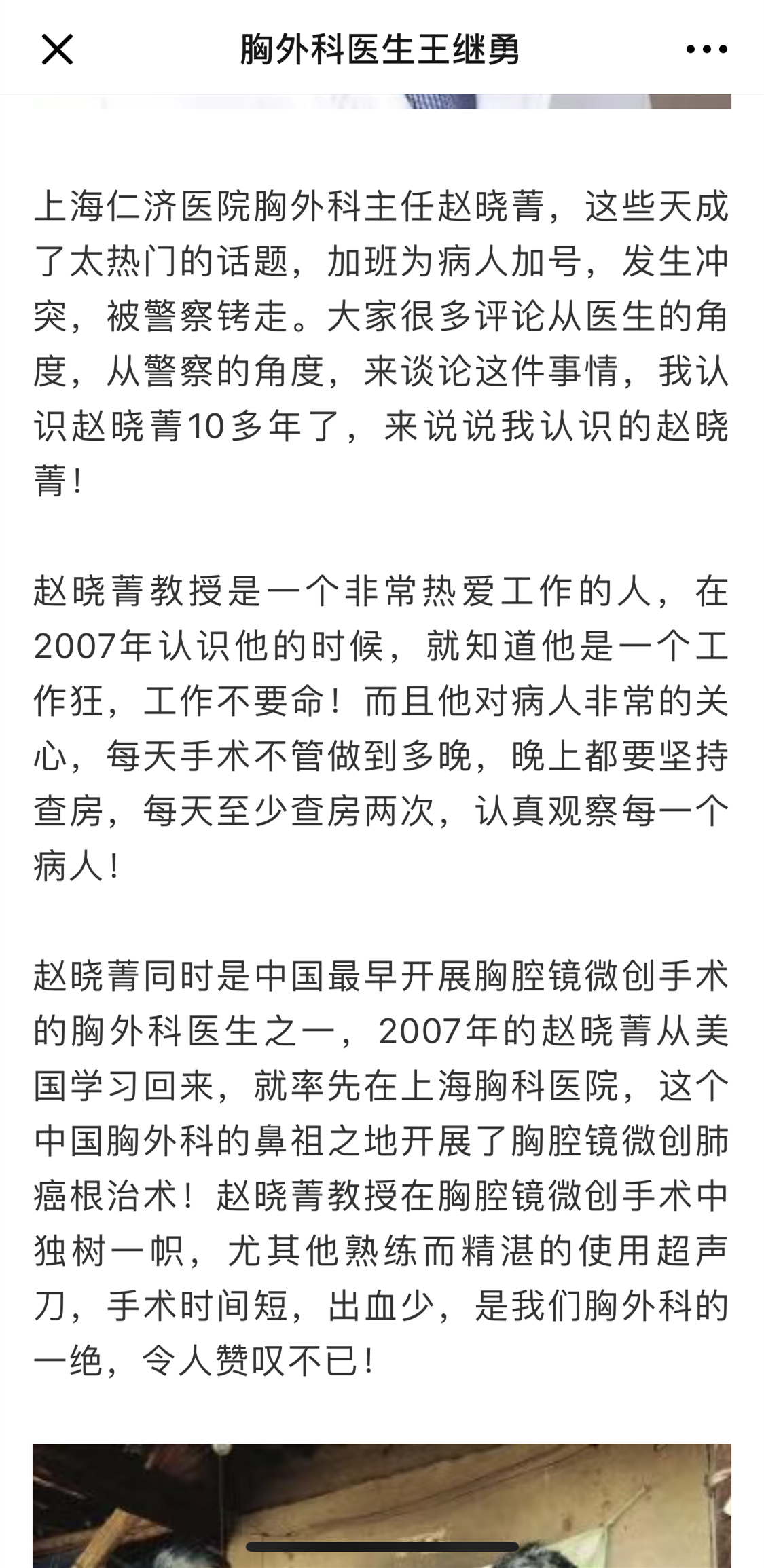 4月24日,网传上海仁济医院胸外科主任医师赵晓菁在接诊过程中,由于拒绝一位病人家属的插队要求,和该家属在诊室起了冲突,随后浦东警方到场后铐走了赵医生。