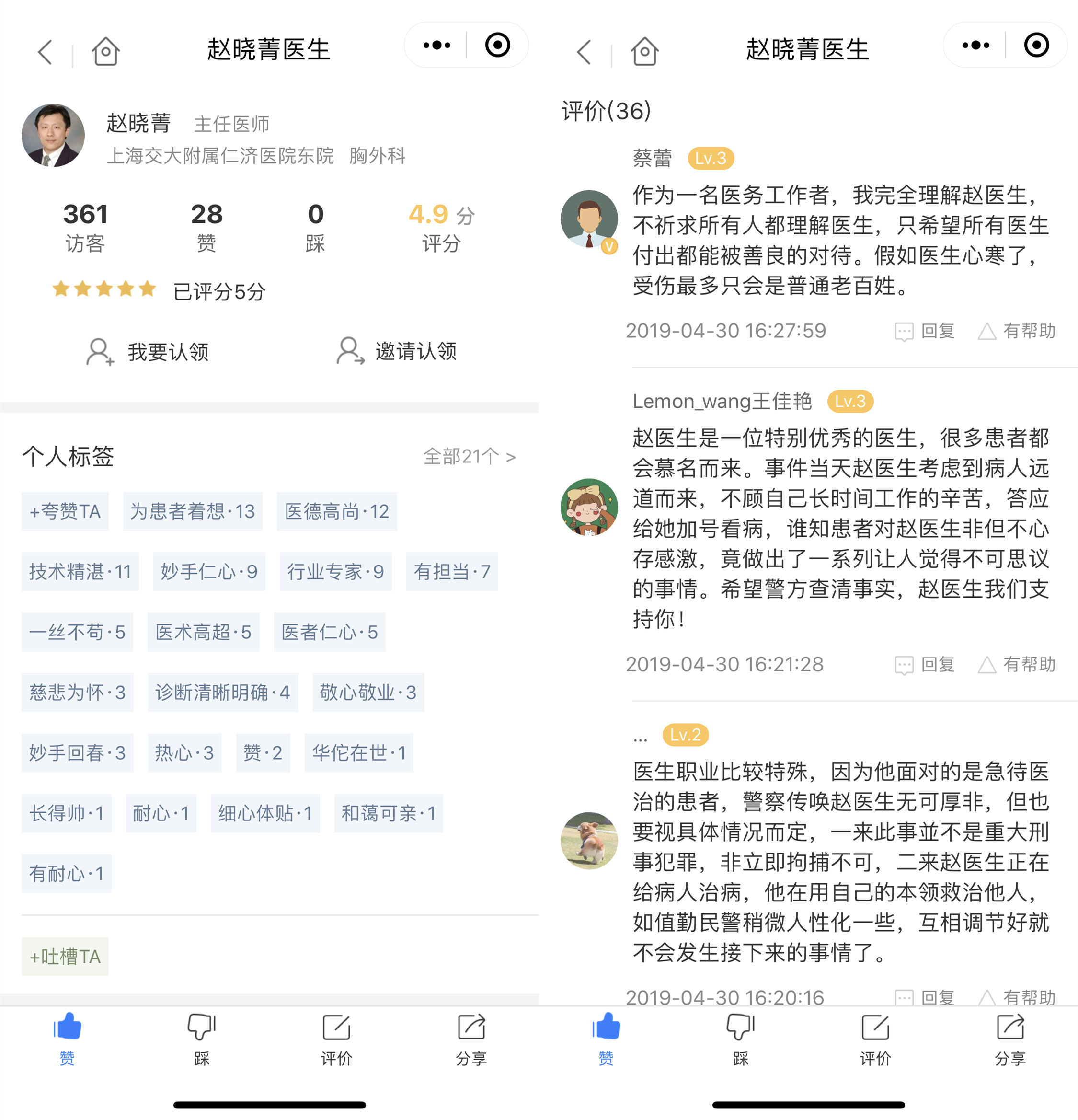 我支持仁济医院赵晓菁医生,希望所有医生都能获得应有的尊重!