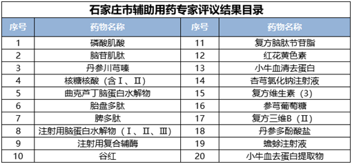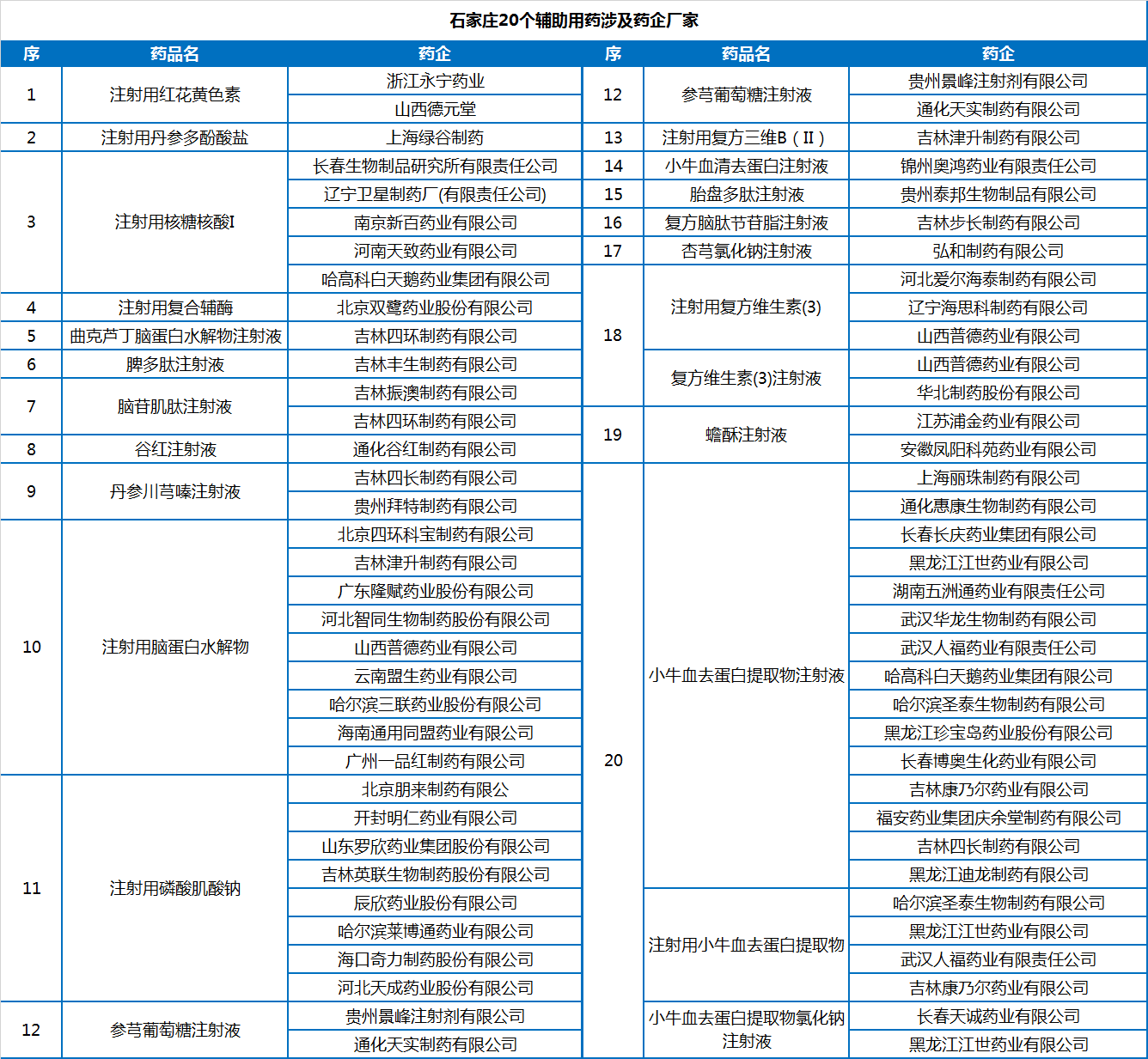 近日,一份石家庄市卫健委发布的《关于医疗领域辅助用药问题专项整治工作的补充通知》在业内流出。该通知公布了《石家庄市辅助用药专家评议结果目录》,涉及20个辅助药品。