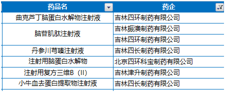我们发现在这份厂家目录中,四环集团首当其冲,其涉及的产品众多,波及旗下多个制药公司。20个辅助用药中,和四环集团有关的就多达6个,来自四环旗下5个生产基地。其中曲克芦丁脑蛋白水解物注射液、脑苷肌肽注射液和注射用复方三维B(II)这三个药品的市场主要就是四环集团控制,旗下公司几乎占据三个产品的全部市场份额。脑苷肌肽注射液在2015年销售额达到34亿,其中吉林四环28亿,吉林振澳6亿。