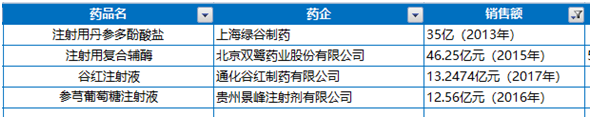 这20个辅助用药,除了四环脑苷肌肽注射液,还有四个厂家产品年销售额超过10亿。这些为厂家贡献了超10亿元的大户是,上海绿谷注射用丹参多酚酸盐,北京双鹭注射用复合辅酶,步长药业的谷红注射液,景峰制药的参芎葡萄糖注射液。尤其是北京双鹭注射用复合辅酶2015年迈进了40亿元门槛。虽然双鹭产品线长,产品多样,但是单就注射用复合辅酶这个产品就为公司贡献超过一半的销售额,可谓主力产品。