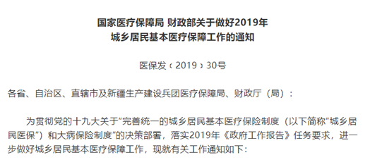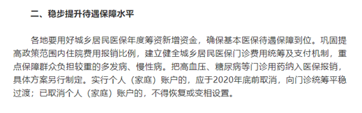 5月10日,国家医保局官方微信公众号发布《国家医疗保障局 财政部关于做好2019年城乡居民基本医疗保障工作的通知》。其中明确提到:“巩固提高政策范围内住院费用报销比例,建立健全城乡居民医保门诊费用统筹及支付机制,重点保障群众负担较重的多发病、慢性病。把高血压、糖尿病等门诊用药纳入医保报销,具体方案另行制定。实行个人(家庭)账户的,应于2020年底前取消,向门诊统筹平稳过渡;已取消个人(家庭)账户的,不得恢复或变相设置。”