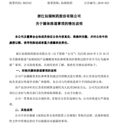 所以仙琚制药这次难辞其咎,将会导致后续营销的一些列问题,例如关于企业内控、合规制度建立、代理商管理等等。
