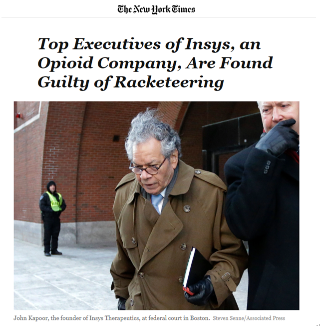 今年五月,美国马萨诸塞州联邦检察院对Insys及其运营子公司提起诉讼,指控其五项欺诈罪名。五名Insys前高管因涉嫌参与Subsys的营销而被判犯有敲诈勒索罪。目前,共有八名公司高管在波士顿因非法销售Subsys而被定罪。