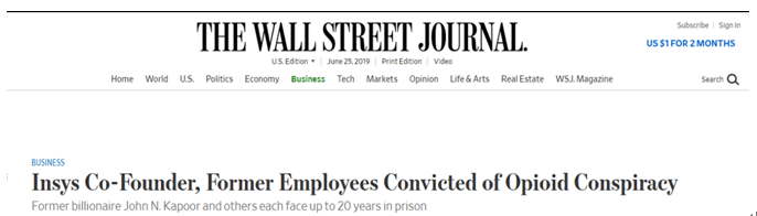 Insys前几年股价还在47美金,市值30多亿美金(合人民币200亿)昨天收盘只有2毛9!这是21世纪以来,全世界第一个因为给医生巨额回扣被抓而破产的中大型药企!该案件一经曝光即备受《纽约时报》、《华尔街日报》等美国各大媒体关注,频频登上报刊头条。这起案件直接导致公司申请破产,公司创始人、前董事长因重罪判刑,是迄今为止落马的最高阶制药公司高管,Insys这也是历史上第一个因被罚巨款而申请破产保护的阿片类药物生产商。美国近年阿片类药物滥用成灾,而此次涉案的制药公司多年来运行一个专门贿赂医生的腐败网,指使医生给不需要镇痛剂的患者大量开药,使得该公司的阿片类药物销售额扶摇直上。