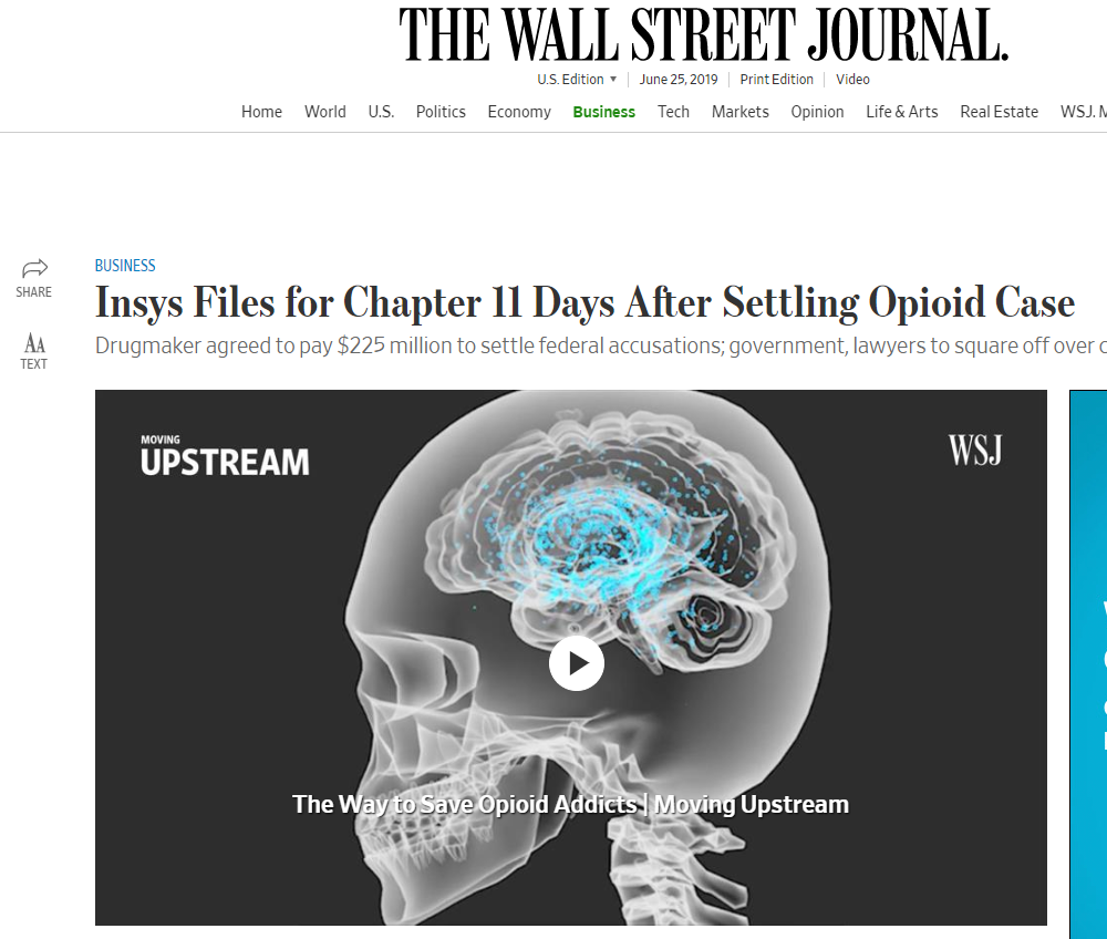 除了巨额罚款和高管定罪之外,Insys还面临集体诉讼,股市大跌,已于6月10日向法院申请破产保护。由超过1800个州、市和社区组成的集体诉讼案律师表示,他们会继续对Insys Therapeutics等鸦片类药厂采取行动,争取数以十亿美元的赔偿,包括公共财政开支、成癮治疗等。