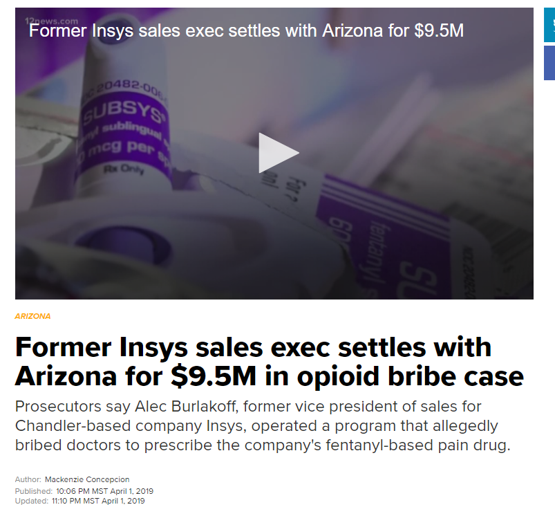 2019年4月,前销售副总裁Alec Burlakoff同意向亚利桑那州司法部长Mark Brnovich支付亚利桑那州950万美元的民事赔偿金。Brnovich指控Burlakoff实施一项向医生支付回报丰厚的“演讲费”计划,以鼓励医生开出更多的芬太尼止痛药处方。Burlakoff必须向该州支付所获收益520万美元,以及430万美元的民事罚款。作为和解协议的一部分,Burlakoff同意成为Insys案件的证人,并将永久禁止在亚利桑那州做广告或销售任何药品。