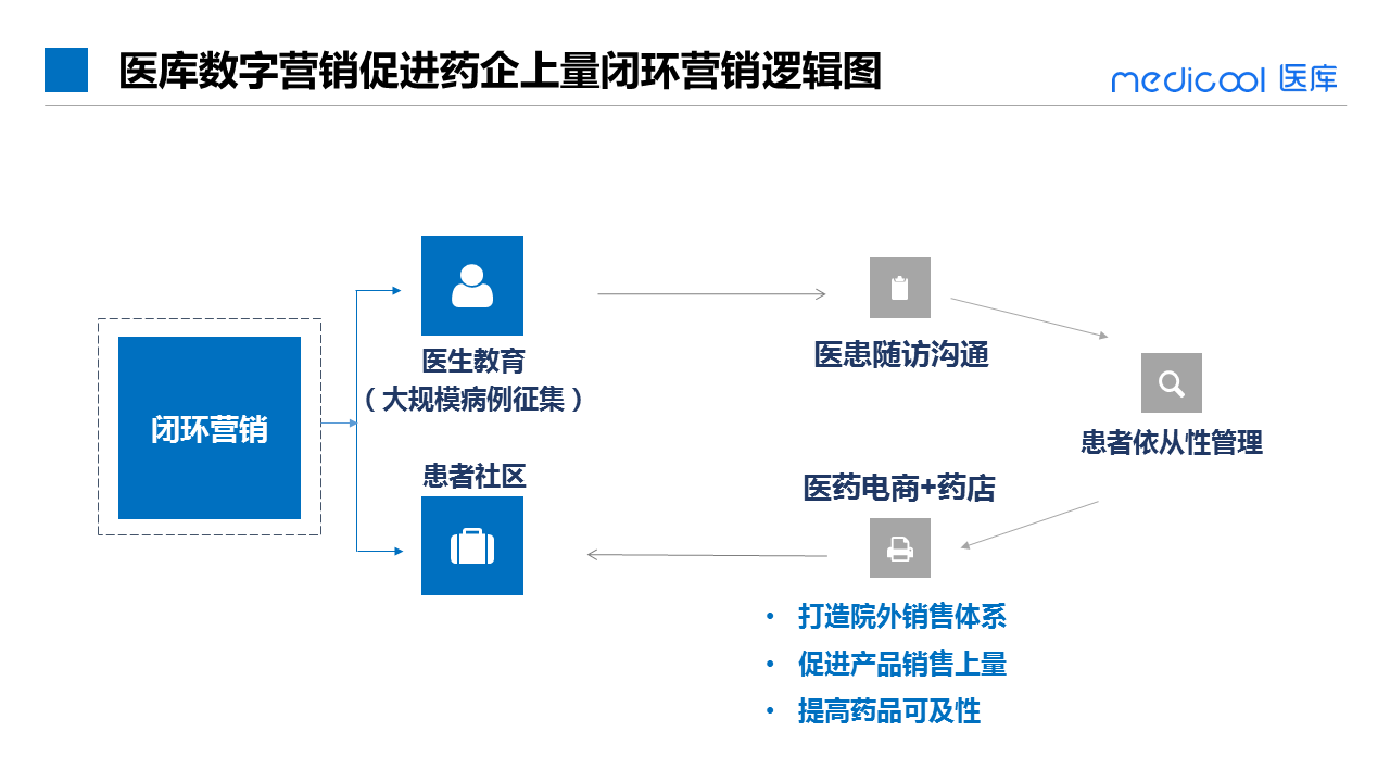 患者依从性管理闭环路径,从医生、患者两端构建药品全渠道营销构建护城河,推动药企市场部的学术职能和品牌建设,促进销售推广和潜力挖掘,真实有效地推动药品销量上升。该闭环路径不仅投入产出比高,而且数据全程透明可控,帮助药企打造合规的营销体系。