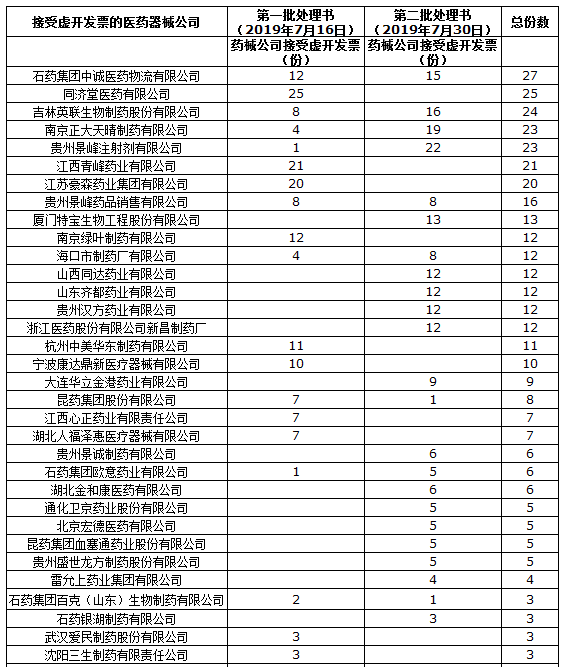 这一系列的处罚书,分为两批被公示,第一批在7月16日,第二批在7月30日,在多家被税务检查的公司中,有11家公司在没有真实业务的情况下向医药器械公司虚开增值税发票,在两批公告中被认定接受虚开发票的药械企业总共有95家,其中包括了一些较大的药企,比如正大天晴、贵州景峰、豪森药业、江西青峰等等。
