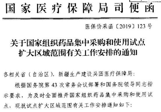 近日,国家医保局发布通知文件——《关于国家组织药品集中采购和使用试点扩大区域范围有关工作安排的通知》。
