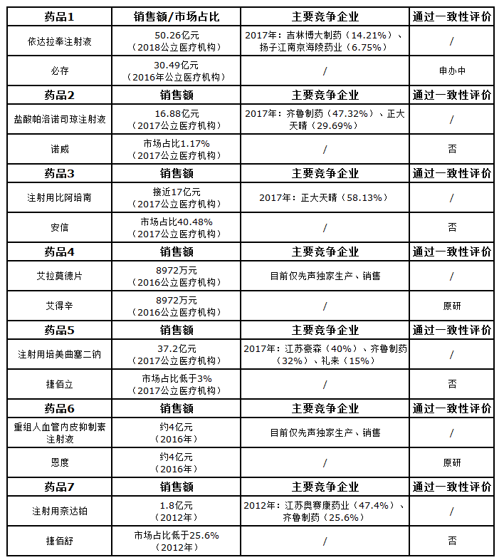 我们先来看下这7个产品的全国销售额、市场占有率和主要竞争对手,而且在严打彻查没有回扣的情况下,是否还能保有市场?
