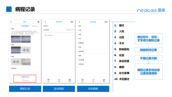 医生通过文字、拍照或者录音的方式收集病例、随访患者。医学编辑会将收集到的有效病例进行人工整理,形成格式化病例并汇总。