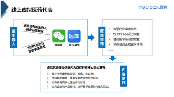 在线“虚拟医药代表”可以进行广泛医生的触达和低成本的持续营销。通过在线群组根据药企、科室、地区的不同特点,进行持续的学术推广。