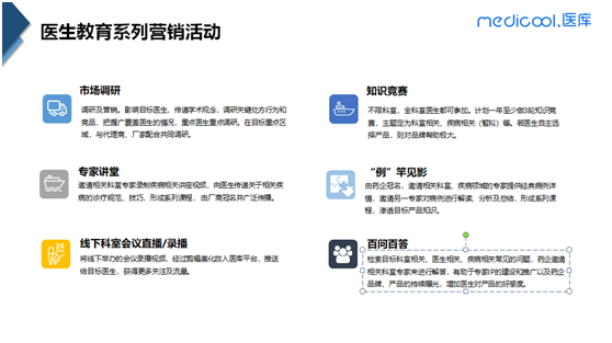 如:在线专家讲堂、市场调研、知识竞赛、科室会议,文章投放等,将学术信息方便高效地传递给医生。
