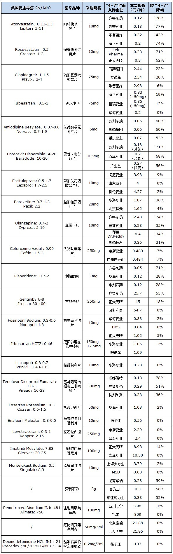 4+7全国扩面结果9月底出炉后,据上海阳光医药采购网公布的数据显示,参与本次联盟采购的企业共有77家,最后产生拟中选企业45家,拟中选产品60个。与联盟地区2018年最低采购价相比,拟中选价平均降幅59%;与“4+7”试点中选价格水平相比,平均降幅25%。