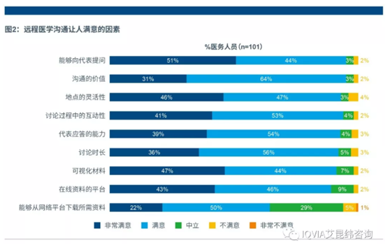 101位医务人员中,90%以上对于其中的前八个因素表示满意或者非常满意。尤其是远程沟通可以向医药代表提问,以及沟通的价值广受医务人员的认同。可见,医务人员看重在远程讨论中向代表提出问题,而绝大多数医生非常肯定整个交流互动带来的良好价值。