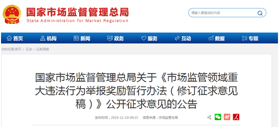 11月19日,国家市场监督管理总局发布《市场监管领域重大违法行为举报奖励暂行办法(修订征求意见稿)》(以下简称“《办法》”)公开征求意见通知。鼓励社会公众积极举报市场监管领域重大违法行为。