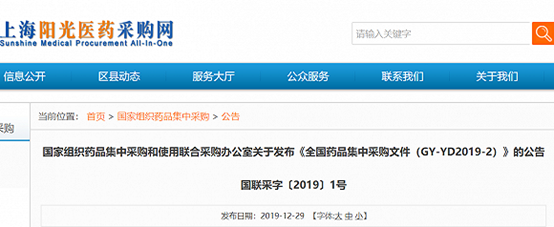 12月29日下午14:00多上海阳光医药采购正式发布《国家组织药品集中采购和使用联合采购办公室关于发布《全国药品集中采购文件(GY-YD2019-2)》的公告国联采字〔2019〕1号》,共计三个附件。