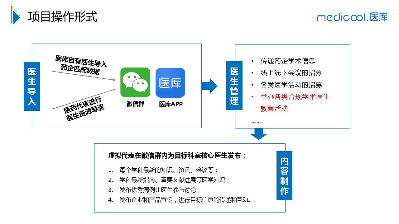 配合药企市场部的线上与线下活动,通过APP和微信对医生进行管理,定期向医生发布每个学科最新的知识、资讯、指南、病例讨论、重要文献进展、最新会议,发布企业和产品宣传,同时还能实现线上线下会议的招募,进行各类合规医学活动。