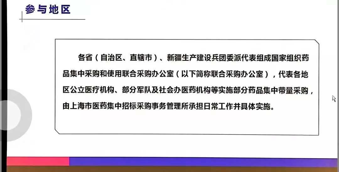 那么我们将于2020年的1月份正式开展我们第2批国家组织药品集中采购和使用工作,那么为了顺利的推进第2批集采工作,所以我们今天在这里召开相关的一个政策解读会,上午我们会把这个采购文件就是我们标书的内容进行一个详细的解读。上午以及下午一整个下午的时间还留给大家做1对1的分组答疑,所以尽可能全面的为大家进行答疑解惑,也为大家的申报提供些许的一些帮助。那么今天我的这个内容就是讲解的内容主要分为5个部分来进行。第1个是对文件进行相关的说明,第2个是指导大家对申报报价有更好的理解。第3个是讲解我们中选药品确定的规则,第4个是材料的封装,最后一个是跟大家再重申一下这次开标的时间和地点。第1个我们还是先来讲解一下我们的文件说明,也就是我们标书的内容。首先第一部分本次药品集中采购参与的地区,包括了全国31个省、自治区、直辖市以及新疆生产建设兵团,以上的地区委派代表组成联合采购办公室,代表各地区公立医疗机构、部分军队及社会办的医药机构等实施部分药品集中带量采购,那么日常的工作以及具体的实施,仍然是由上海市医药集中招标采购管理事务管理所来具体承担。