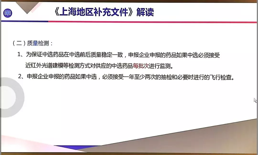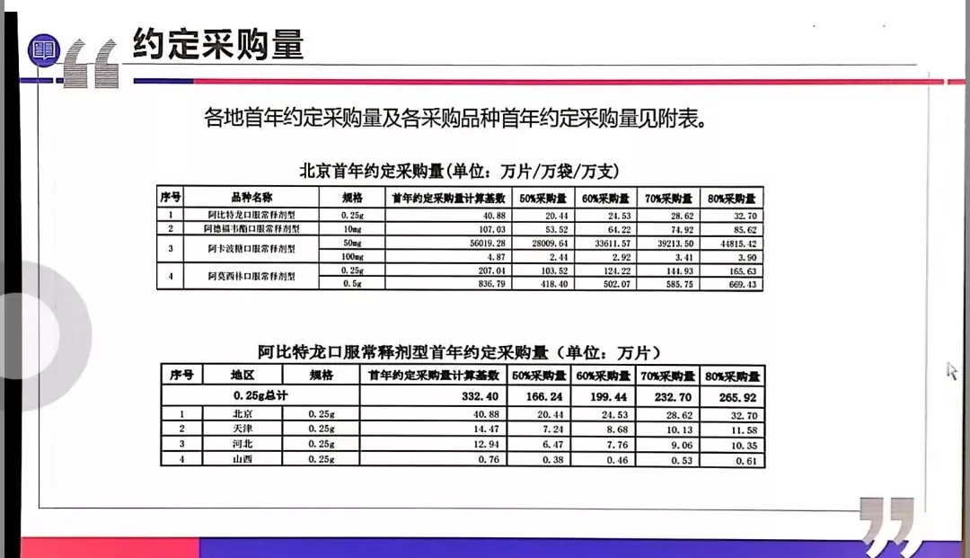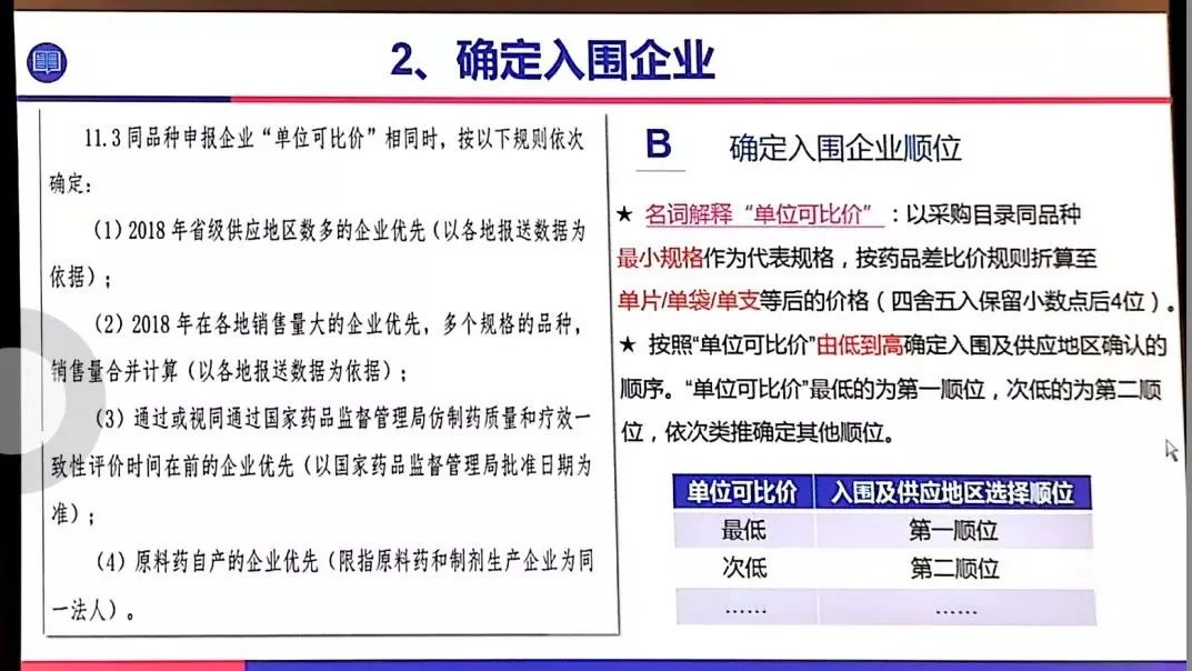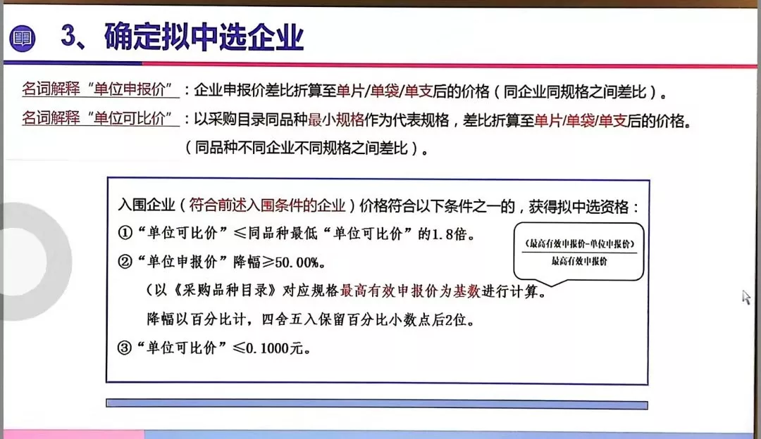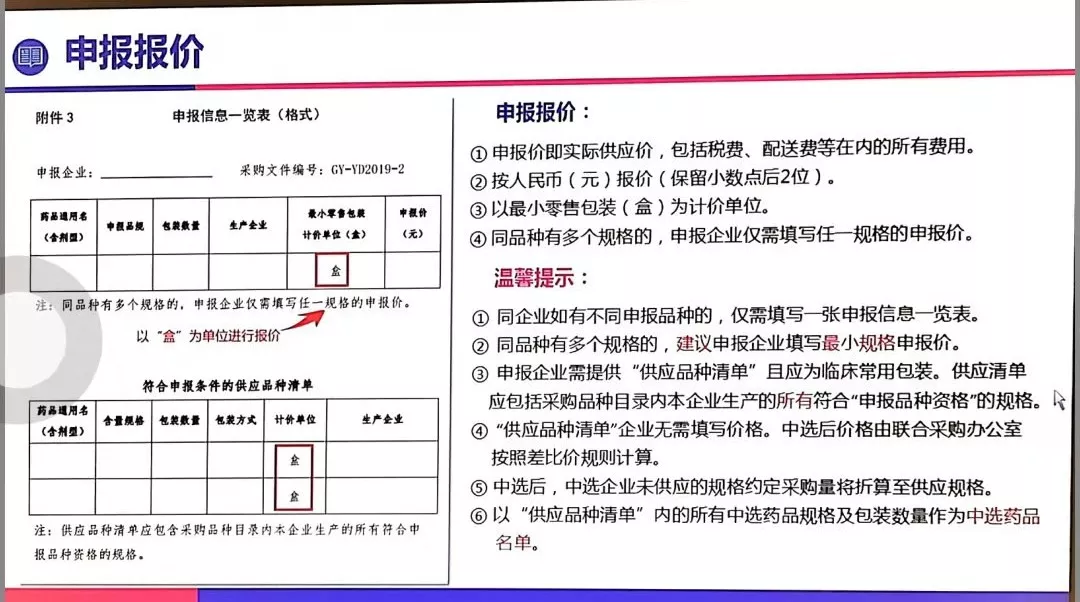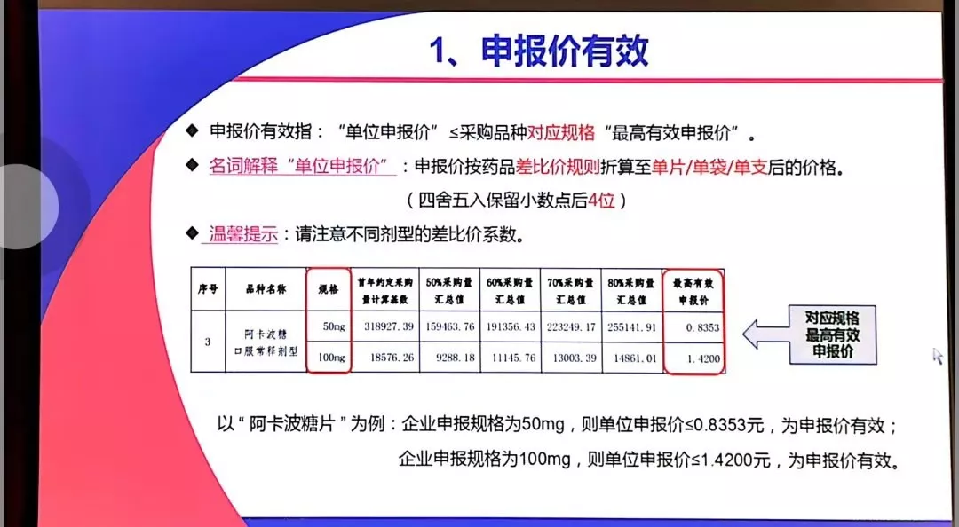 所以我们可以看到第3个,我们以阿卡波糖口服常释剂型为例,他一共有招标两个规格,一个是50毫克,一个是100毫克。假设我们某省区中选企业A50毫克和100毫克均通过了一致性评价,那么该企业的50毫克与100毫克在这个省区市同时供应的。如果在另外一个省区,它的中选企业只有50毫克通过了一致性评价,而100毫克没有通过一致性评价,也就是说它的100毫克无法供应。那么100毫克相应的约定采购量将按比例折算至50毫克,仍然由这个中选企业来供应,也就是说我们不是按照规格,不是按照50毫克来招标100毫克来招标,我们是按照整个品种进行招标的,我们称之为招标单元。第2部分话,蓝色框框呢主要是这个约定采购量,各地的首年约定采购量计算基数,注意是计算基数,是由各地上报确定的。那么具体的各地、各品种首年约定采购量是由全国实际(注意实际两个字)中选企业数决定的,那么具体相应的比例到底是50、60、70还是80,我们在后面的采购文件当中也会具体讲到。另外还有这个采购品种当中,这次33个品种里面有部分自费的品种,那么自费的品种是和我们招标目录当中医保目录内的中选品种一样,同样都是享受医保基金按采购金额的一定比例来进行预付的。就只是预付,不是报销。第3部分是最高有效申报价,这个部分是明显区别于前两次招标的,这是我们在这一次全国药品集中采购的一个初步探索,也就是我们设定了一个最高有效申报价,可以看到我们这个单位是元,一片一袋一只的价格,也就是最小制剂单位划到每一片药每一袋药以及每一支药的价格。那么具体采购品种当中,每一个规格的最高有效申报价,都是由联合采购办公室根据各地上报的数据来综合确定的。这个价格是联合采购办公室综合确定的。那么在采购文件当中也对这个价格做了相关的表述,也就是企业的单位申报价因小于或等于采购品种对应规格的最高有效申报价,具体什么叫做企业的单位申报价对应规格如何理解?我们在后面也会具体的来讲到,那么这个是我们标书的第1个部分。这个是采购文件的附表部分,附表我们分了两块,一个是各地区的首年约定采购量,一个是各个采购品种的约定采购量,我们把计算基数以及相应的50~80的比例都换算好,就呈现给大家了。所以每个企业在进行这个市场情况分析以及决策的时候,都可以根据我们这个附表来做相关的查询以及参考。大家注意,下面我们看一下我们这一次的采购周期和采购协议,那么我们的采购周期是指中选结果,实际执行日期以年为单位,因为刚才前面讲到我们在采购量的约定采购量的计算的比例的基础上还会有相应的比例,那么这个比例就是根据全国实际中选企业的家数来确定的。同样我们这次的采购周期也与全国实际中选企业有关,我们看一下这张表,实际中选企业为一家的,约定采购量是50%,采购周期是一年。实际中选企业为两家的是60%,采购周期为两年。实际中选企业为三家的采购量是占基数的70%,同样采购周期也是两年。中选企业为4家及以上的,那么约定采购量是占计算基数的80%,采购周期为三年。那么采购周期内我们有两年到三年的,超过一年的采购周期,采购周期内我们的采购协议也是每年一签的,所以这个合同并不是说是一签就两年或三年,这个量也并不是一成不变的。所以我们这次标书当中标出来的约定采购量以及相应的比例,也仅仅是我们采购周期当中第1年的合同约定量。所以为了保障这个中选企业的一个相应的市场份额,所以我们在标书当中也讲到,我们在续签第2年和第3年采购协议的时候,我们的约定采购量原则上将不少于该地区该种选品种上一年的约定采购量,这是为了保障我们中选企业的一个相应的市场份额。那么在采购周期内,若提前完成当年采购量的这个可能也有多种因素,一个是可能某些地区报量的时候相对来说比较保守,也或者是中选企业供应以后,因为对同品种也进行一个相应的替代,所以可能会造成这样一个放量的一个增长。所以如果提前完成约定采购量超过的部分,中选企业仍需要按照中选价来进行供应,直至采购周期届满。那么其实超量的部分国家也在鼓励,就是对于超量的部分,那么在后期的国家的文件或者是各地的这个配套文件当中,也会有相应的落地的一个政策。下面是一个执行说明,我们采购的周期当中,医疗机构必须优先使用集中采购中选的品种,并且确保完成约定采购量。那么为了保证这个优先使用,各地在这个结果落地以后,也会出台一些相应的配套措施以及配套文件来保障中选药品的优先使用。而对于未中选的药品,各地也将按照工作要求,就位中选药品的价格调整为中选药品的使用、购销协议、药品配送、质量检测等等,来发布相关的一个补充文件,那么剩余的用量也按照当地就是每个地区它自己的药品采购管理的有关规定,适量采购同品种价格适宜的其他药品。这个地方一个是适量采购,一个是价格适宜。那么我们上海是在12月31号的时候,就是发布了上海地区的一个补充文件,在我们上海的补充文件当中,也对于这个适量采购以及价格事宜、未中选品种的使用也都进行了一个相关的一个约定,那么在接下来我也会对这个上海的文件也进行一个简单的讲解,我们先把这个国家的文件先讲好。接下来是一个申报资格,申报的企业资格以及申报的品种资格,如果参加过前两批的就知道我们