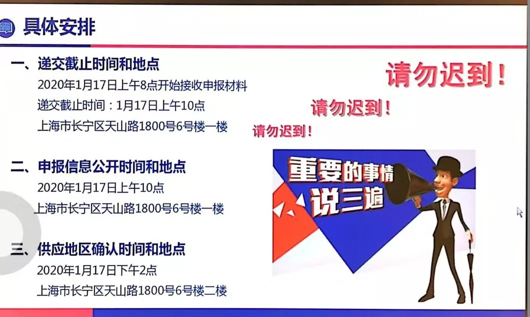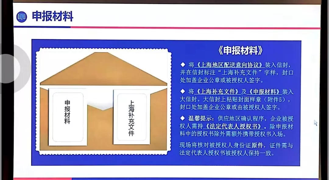 其实我们已经开标开过两次了,然后每一次开标的时候都有企业是装订错误的,就是把这个申报信息一览表跟那个申报材料两个就合在一块了,然后我们当天会在外面签到的地方都会有一些什么剪刀、胶水或者是信封袋的,就是为了防止大家这个装订错误,然后现场把它拆下来再重新装,但是因为这样你这个文件的这个保密性和密封性就破坏了,所以到时候这个万一这个资料在拆封的过程当中造成的泄露,我们也是不负责的。因为这是由你们自己装订错误造成的,而且当天因为企业也比较多,时间也比较紧,我们希望大家就是这个材料的装订一定要保证正确无误,可以节省我们的时间,也可以节省大家的一个时间。所以这个信封申报信息一览表一定要单独封装,不要再申报,不要跟那个申报材料放在一块申报材料里面,你可以附一张纸,你可以装在那个文件夹里面,但是一定要额外再单独装两份申报信息一览表,因为这个是用于我们当天的申报信息公开大会的当天,唱标的时候要现场把这个材料进行启封的。申报材料因为我们当天是不开的,所以你装在里面是没有用的。这个就是我们的申报材料跟刚才那个是两份。第1个它包括了申报材料,还有刚才讲到的上海的一个补充文件,上海的补充文件就只有这个上海地区配送一项协议,也需要单独封装在一个小信封里面,然后再装到一个大信封里面,该封装的封装,然后该签字签字。然后还有一个地方要提醒大家,就是刚才讲到我们申报材料里面有一份法定代表人授权书,你装在里面是OK的,但是一定要被授权人当天一定要随身携带一份到两份。因为当天我们下午供应区确认的时候,现场公证人员是要进行这个身份证的核验的,或者是这个人脸的面部识别,都是要跟你的这个身份证的原件去比对的,你必须手拿身份证原件以及法定代表人授权书,你才可以就是验证你的被授权人的身份,才能够进去进行供应地区的选择。所以就是比如说我到时候我法定代表人授权书没有带,我现场再去开那个申报材料,再去拆开再去复印,这个就非常的浪费时间了。所以这个代表人授权书多带几份也无妨,就证明大家的一个身份。最后一个,我们讲一下我们的时间和地点,1月17号天山路1800号6号楼,就还是在今天我们大家培训的这样一个地方,然后还有地址也都在上面,相信大家对这个地址还是非常熟悉了。所以说我们还有一个最最重要的事情就是一定要放在最后讲,如果前两次来参加过培训的朋友可能也知道,就是因为每次也都是我来讲嘛,肯定也知道我接下来要放什么,因为我每次都很懒,这个PPT的模板都不换的,就每次都用同样的一个模板,所以最重要的事情就是说三遍,一定一定不要迟到,因为我们是10:00就递交就截止了,这个材料我们10:00就准时收摊了,10:01我们这个材料都不会再收了,所以希望大家也提前做好一个线路的规划,以及相应的一个食宿的一个安排。那么我们就2020年的1月17号准时就相约在这里,也希望大家一切顺利,也预祝大家新春愉快,过个好年。