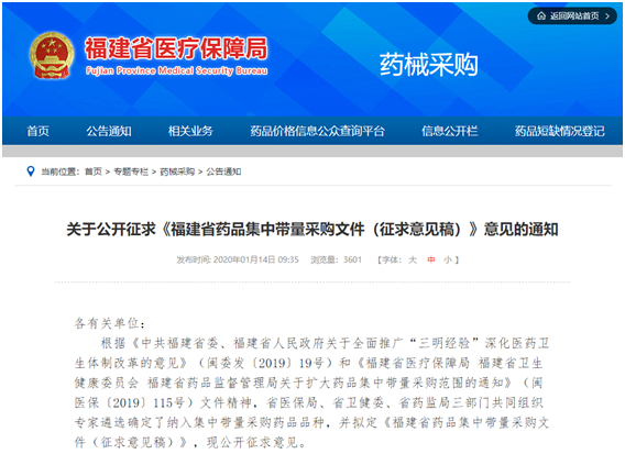 福建省医保局发布关于公开征求《福建省药品集中带量采购文件(征求意见稿)》意见的通知。