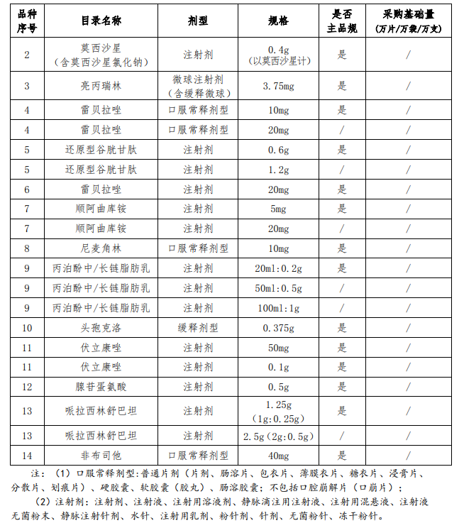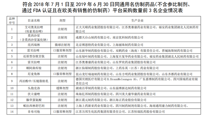 在采购金额较大、竞争充分、临床使用成熟、同一通用名尚未有仿制药通过质量和疗效一致性评价的药品中,通过专家遴选形式确定了以下采购品种,包括头孢克洛、雷贝拉唑、尼麦角林、莫西沙星等14个品种入围。并按照全省公立医疗机构2018年7月1日至2019年 6月30日同通用名仿制药品(不含参比制剂、通过 FDA 认证且在欧美有销售的仿制 药)总用量的70%确定采购基础量。