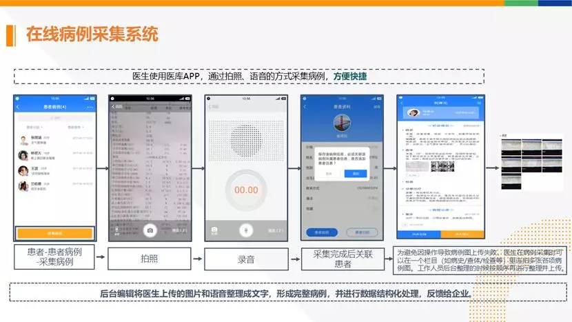 使用结构化的病例采集工具作为载体,不需要代表们手把手指导,医生只要在APP上一键将病例拍照上传,后续就会有编辑后台整理,形成完整的结构化病例。