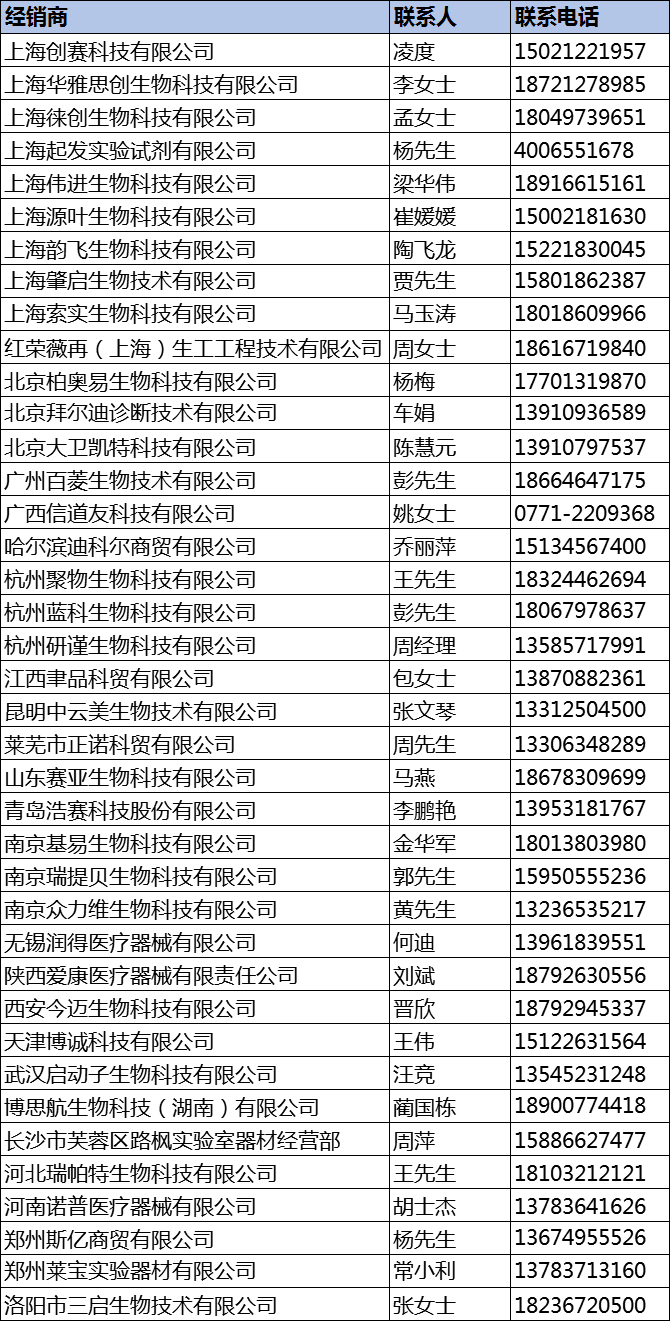 在此疫情非常时期,我首先想到了我们第二军医大学军医系的同学们,特别是一线临床的急诊科呼吸科与发热门诊的都赠予了一瓶。(可惜发给我军大和其他军区医疗队援助武汉的数十瓶因为快递不发液体的原因被退回) 然后我们决定,对全中国的血站,血液中心与脐带血库均免费赠予一瓶,因为接下来如果证明治愈者的血浆对重症患者有效,你们会非常辛苦,也增加了接触到的风险。(后面告知联系方式,没有赠完为止的说法,每家都赠!) 我的母校第二军医大学的所有科研实验室,以科室为单位均免费赠予一瓶,三所附属医院,长征医院、长海医院、东方肝胆外科医院,每个科室均赠送一瓶! 然后对全中国所有的客户我们不但不会涨价,即使现在进口运费异常高昂,直接降到1000元/每瓶,即使现货都被抢光了,加上我们还赠送了很多。所以现在紧急要,我们也没有了,不过排除万难,以及欧美国家对我们国家的禁飞,1月20号也就是一周后,我们将从德国分批进口一个集装箱的货,有需要的可以跟德国WAK公司中国独家总代理上海博光生物高秀红联系预约,包括我们所有承诺赠予的对象! 全国各地的客户,也可以联系当地的经销商就近购买,也欢迎其他经销商与我们联系,名单如下: