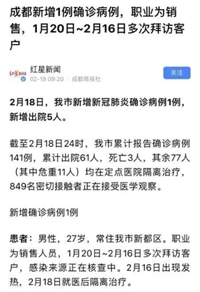 近日,四川成都通报了1例新增确诊病例,是当地某药业一名医药销售人员。该销售人员在2月16日发热,18日就医后确诊,已被隔离治疗,感染来源正在核查中。糟糕的是,这名医药代表于1月20日至2月16日曾多次拜访客户,目前已在联系曾接触人员。