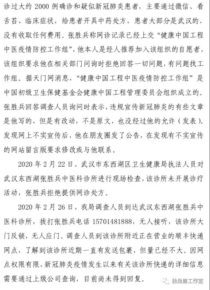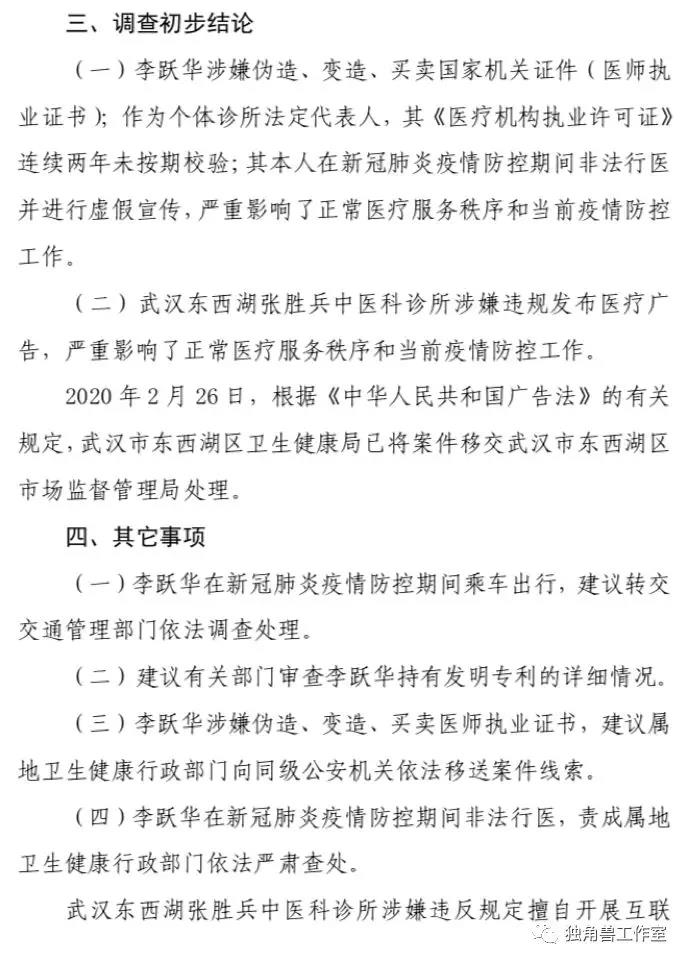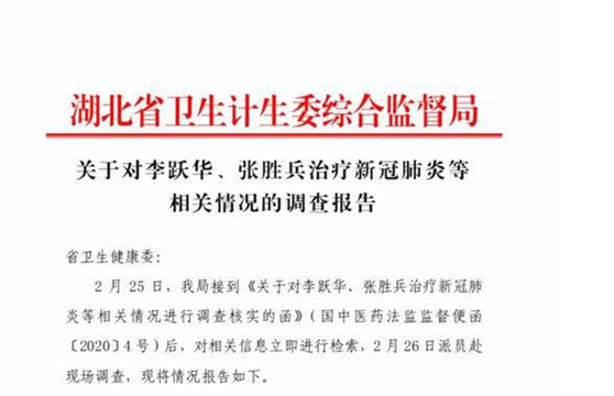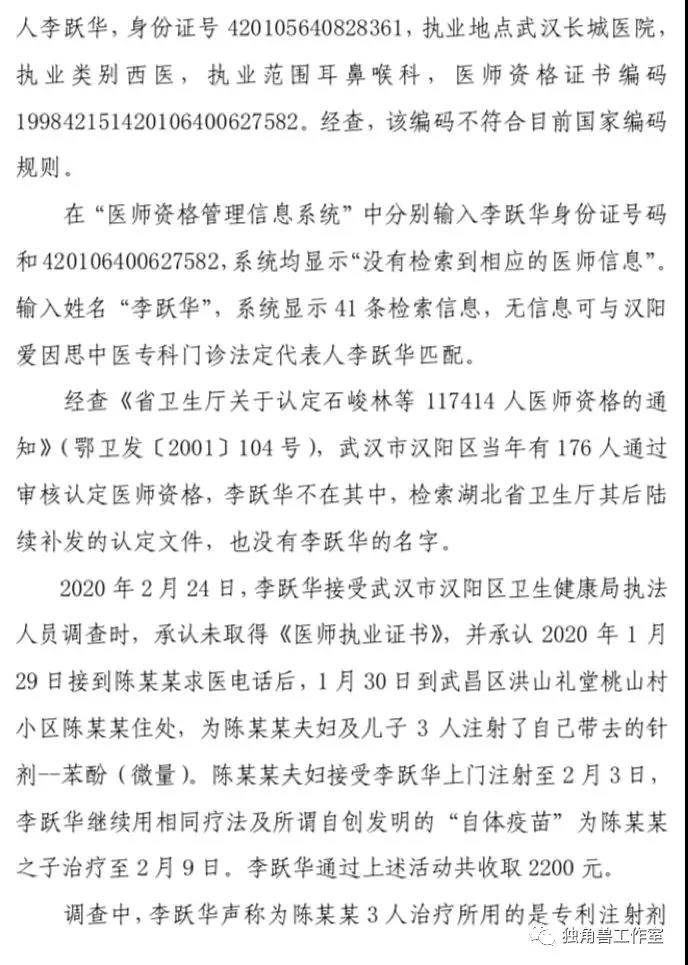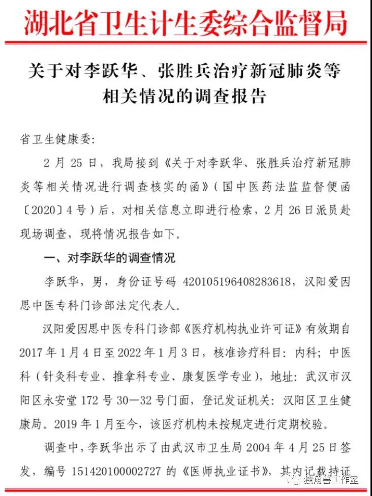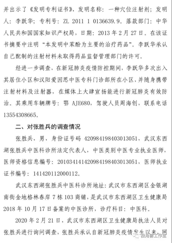 2月26日,湖北省卫计委综合监管局介入调查。3月1日,官方发布一份《关于对李跃华、张胜兵治疗新冠肺炎等相关情况的调查报告》(简称《报告》)调查结果显示,李跃华涉嫌伪造、变造、买卖医师执业证书,建议属地卫生健康行政部门向同级公安机关依法移送案件线索;其本人在新冠肺炎疫情防控期间非法行医并进行虚假宣传,严重影响正常医疗服务秩序和当前疫情防控工作;针对李跃华在新冠肺炎疫情防控期间乘车出行,建议转交交通管理部门依法调查处理;建议有关部门审查李跃华持有发明专利的详细情况;李跃华在新冠肺炎疫情防控期间非法行医,责成属地卫生健康行政部门依法严肃查处。1、是否非法行医先不说,重要的是有没有治疗效果?李跃华治疗方法本质是穴位注射,这是一种中医传统疗法,穴位注射更多是作为一种神经刺激作用,而不是到靶点直接起效应的,也就是说和苯酚灭活病毒毫无关系。另外,病毒主要在肺里,如果通过穴位注射让苯酚进入到肺里,那得多大量。2月20日,在接受采访时,李跃华称,自己用于治疗新冠肺炎的注射剂,是万分之五的苯酚,这种微量所谓直接作用到病毒什么环,应该是他自己脑子想的,没有基本的药物动力学与药效学常识,这块的水平接近文盲!2、既然没有效果,为什么有所谓的治愈?其实病毒源性疾病,还有一个统称叫“自限性疾病”。作为自限性疾病对于免疫力、抵抗力稍微强一些的人,不治也会好。这次新冠疫情我们看到,死亡率(湖北以外地区)只有不到1%,换句话说99%的患者本身也不会有大事,不会死亡,随着时间延长加上隔离,80%以上的轻症患者会自己恢复,和李跃华的注射没有关系。即使在武汉,封城前和封城期间经历了病毒扩散,由于短时间内医疗资源无法承接,很多人被迫在家,其实大部分人都逐步恢复健康,死亡从整体来说只是小概率事件。这也是现在各种神药看似都有神效的根本原因。老百姓也搞不懂到底这病是这个医生治好的还是自己好的,反正看针扎进去了,过阵子好了,那肯定是被医好了。3、未取得医师资格,非法行医。报告作出初步调查结论称,李跃华涉嫌伪造、变造、买卖医师执业证书;2 月 24 日,李跃华接受武汉市汉阳区卫生局执法人员调查时,也承认自己未取得《医师执业证书》。4、李跃华在新冠肺炎疫情防控期间非法行医并进行虚假宣传,在新冠肺炎疫情防控期间乘车出行。这些都严重影响正常医疗服务秩序和当前疫情防控工作。总之,我们还是要相信科学。疫情一个多月以来,武汉人民乃至全国人民备受心灵和肉体折磨。突然有神医降临无异于久旱来甘霖,于是各种其治好新冠肺炎的传言在网上大量传播起来。但是我们还是要具备基本医学知识,作出科学的判断,没有任何科学道理的、胡编乱造的治疗方法不可寄托。附《关于对李跃华、张胜兵治疗新冠肺炎等相关情况的调查报告》全文