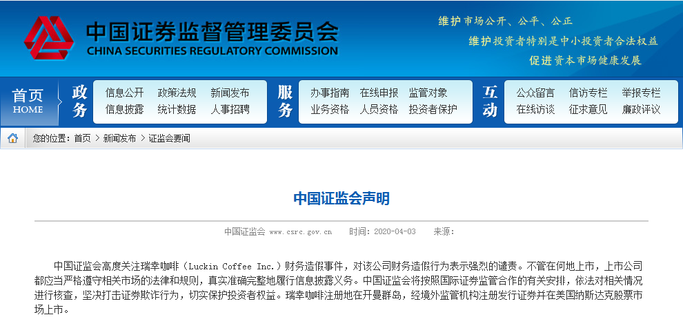2020年4月2日,瑞幸咖啡承认公司在2019年二季度至四季度期间的财务报表虚增22亿人民币交易额。消息公布后,瑞幸股价大跌80%。中国证监会于4月3日下午也对此事发表声明,表示对瑞幸财务造假行为“表示强烈的谴责”,指无论在哪上市,上市公司都应遵守相关市场的法律和规则,真实准确完整地履行信息公开义务。中国证监会将依国际证券监管合作的有关安排,依法对相关情况进行核查。