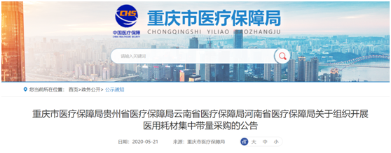 5月21日,重庆市、贵州省、云南省、河南省医疗保障局联合发公告,组织开展医用耗材集中带量采购。四省(市)医保局决定开展跨区域联盟集中带量采购工作。之前坊间传闻重庆、贵州和云南三省要组成西南地区的联盟进行高值耗材的带量采购。但最终官方的公告显示,不仅是上述西南三省组成了地区联盟,还捎上了中原地区的河南省,一个新的四省地区联盟又成立了。