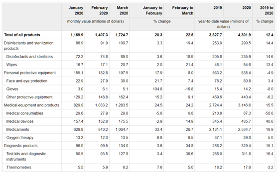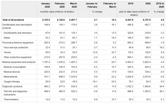 为了解新冠疫情对加拿大国际商品贸易的潜在影响,加拿大统计局出具一份医疗和防护用品的贸易报告。个人防护设备包括:面部和眼部保护设备、手套、其他防护设备