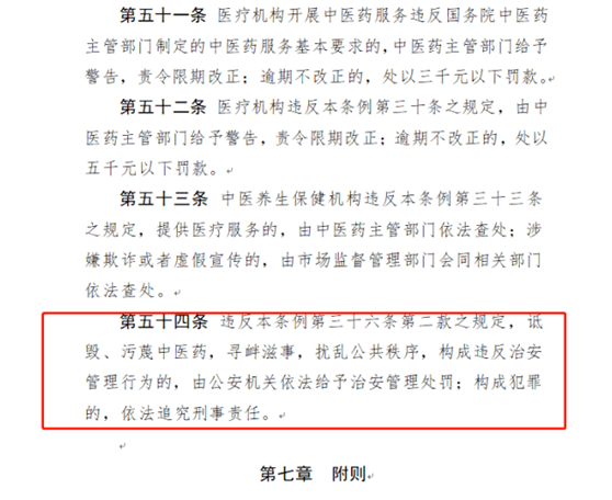 北京市卫健委发布《北京市中医药条例(草案公开征求意见稿)》及说明,公开征求意见,时间为2020年5月29日至6月28日。条例的征求意见稿一共分为七章,分别为总则、中医药服务与保障、中医药规范与管理、中医药保护与传承、中医药开放与创新、法律责任和附则,共计五十五条。内容主要包括完善中医药服务能力建设、完善从业机构和人员管理制度、推进中药服务管理制度创新发展、完善中医药人才队伍建设、完善中医药文化保护和传播制度、完善中医药发展保障机制等六个方面。草案中提出建立中医文化宣传舆论保护制度,对以任何形式诋毁、污蔑中医药的行为,依法追究治安、刑事责任。其中,征求意见稿的第三十六条规定,“任何组织或者个人不得对中医药作虚假、夸大宣传;不得冒用中医药名义牟取不正当利益、损害社会公共利益;不得以任何方式或行为诋毁、污蔑中医药。”第五十四条规定,“违反本条例第三十六条第二款之规定,诋毁、污蔑中医药,寻衅滋事,扰乱公共秩序,构成违反治安管理行为的,由公安机关依法给予治安管理处罚;构成犯罪的,依法追究刑事责任。”
