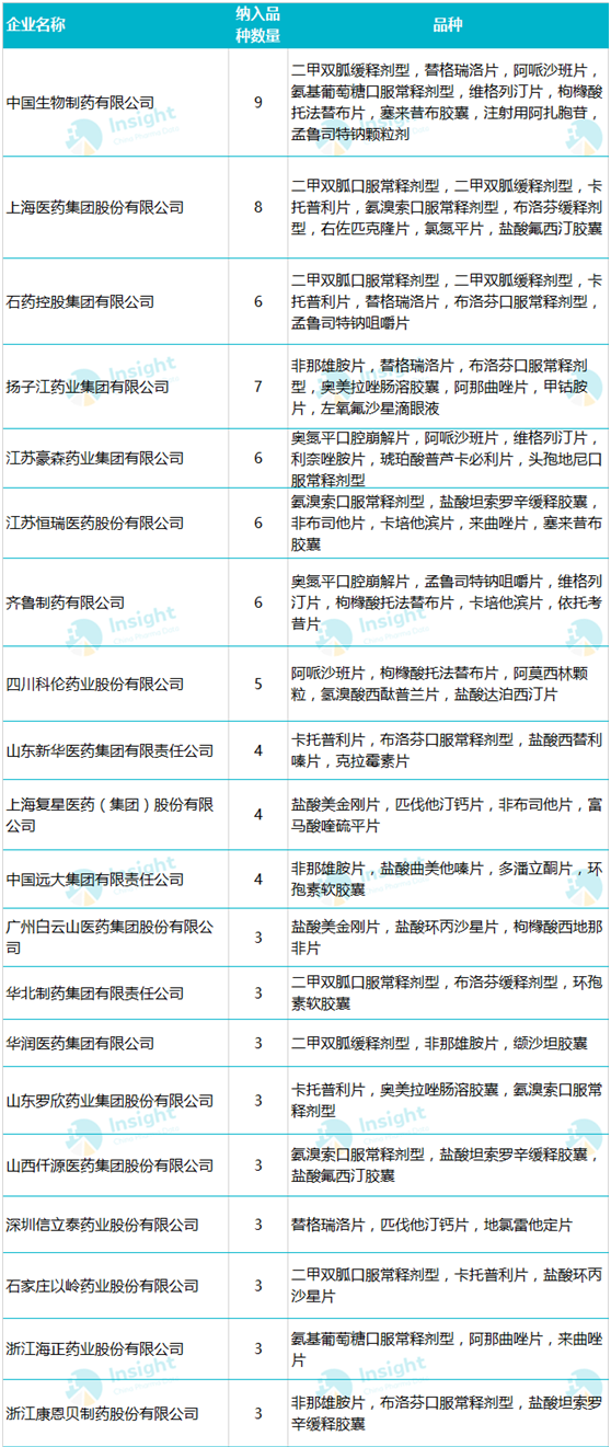 碳酸氢钠、替格瑞洛、西替利嗪、非那雄胺等品种的入围企业均超过5家药企,二甲双胍通过一致性评价的药企多达20余家,竞争激烈程度可以想象。据 Insight 数据库统计,截至7月21日,86个品规符合集采条件的企业共涉及 153 家,其中纳入品种较多的企业包括中国生物制药、上海医药集团、石药集团、扬子江、豪森、恒瑞等。据不完全统计,此次集采还将涉及 21 家外企,其中入选品种较多的企业有辉瑞、默沙东、阿斯利康等跨国制药巨头。