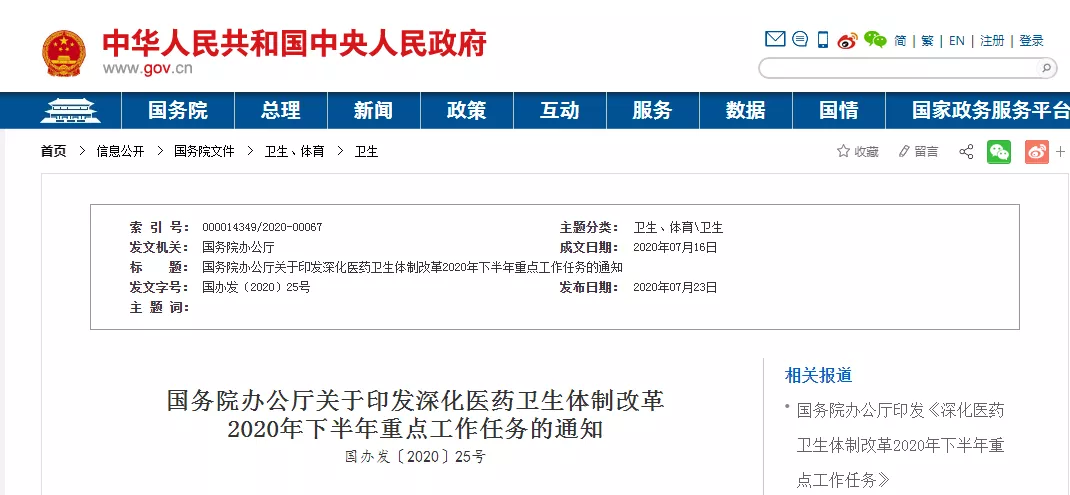 7月23日,国务院办公厅下发《深化医药卫生体制改革2020年下半年重点工作任务》,要求我国医药卫生体制改革继续不断深化,持续改善人民健康状况和基本医疗卫生服务的公平性可及性。主要聚焦六大方面:加强公共卫生体系建设、实施健康中国、深化公立医院综合改革、深化医疗保障制度改革、健全药品供应保障体系、统筹推进相关重点改革。