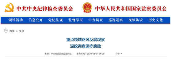 8月4日,中央纪委国家监委网站发布《重点领域正风反腐观察 深挖彻查医疗腐败》称,坚决查处医疗领域严重违纪违法行为。