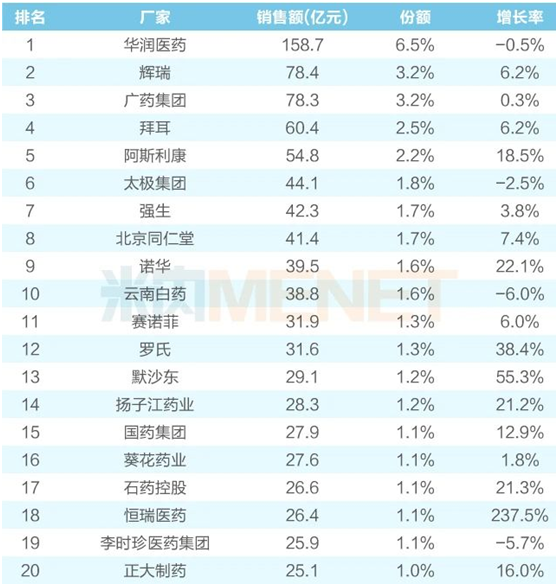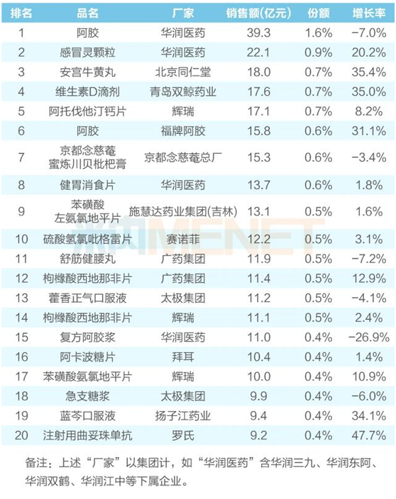 根据米内网数据显示,按终端平均零售价计算,2019年中国实体药店和网上药店(含药品和非药品)销售规模达6620亿元,同比增长8.4%。其中,实体药店占比超80%,网上药店首破千亿。从实体药店各品类结构来看,2019年药品销售额占比超75%,较2018年上升2.1个百分点,受医保政策、国家集采、处方外流、医保药店限制非药品销售等影响,药品占比持续提升。在中国城市实体药店品牌TOP20中,有17个销售额超10亿元,华润医药的阿胶和感冒灵颗粒以39.3亿、22.1亿的销售额占据第一、二位;企业TOP20中,华润医药、辉瑞、广药集团占据前三位置。2019年中国城市实体药店(含地级及以上城市)最畅销品牌TOP20(来源米内网)2019年中国城市实体药店(含地级及以上城市)最畅销企业TOP20(来源米内网)除了广东,山东、浙江、上海、云南等地相继出台药店医保药品集采相关政策,按照要求,零售药店可自愿参加集采。随着医保控费、药品集采等政策的持续推进,药店加入集采已成为零售药店改革不可阻挡趋势,接下来这些药的零售药价也会大幅下降。未来零售药店市场的竞争将进一步加剧,行业集中度的提升,区域性、全国性的医药零售连锁企业逐步形成。