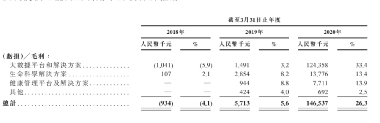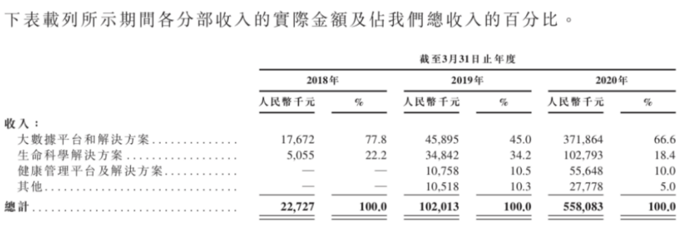 有几个核心数据提炼一下,如医渡云披露:公司有三块主营业务,分别是大数据平台和解决方案,生命科学解决方案,健康管理平台及解决方案。占整个收入构成比和毛利率如下(图2,图3):