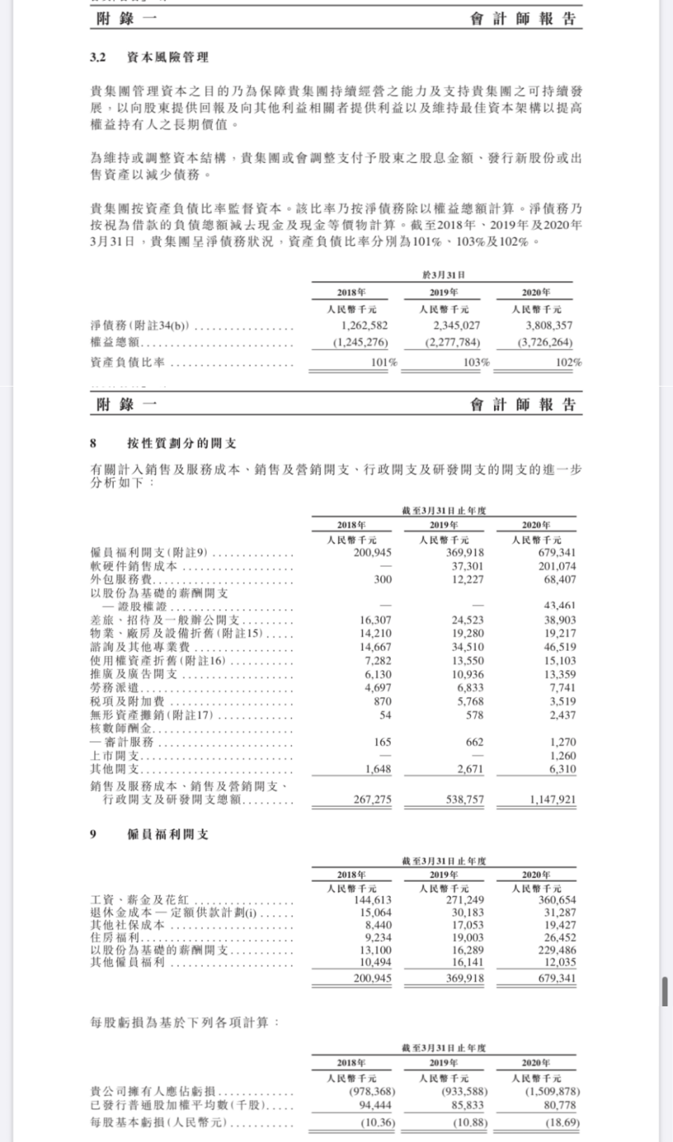 结合图9,我们看到该公司薪酬与员工福利开支约为6.8亿,不算其他商务成本,从2019年增长到2020年3月31的约1000名员工,假定平滑移动均衡招聘,平均薪酬员工约为900人,则每员工平均支出薪酬约为70多万。近三年每股亏损10.36元,10.88元和18.69元(包含股权激励),经调整后的净亏损额见图8:分别为每年2.5亿,4.2亿和3.8亿,但是2020年度自由现金流为-2.3亿。